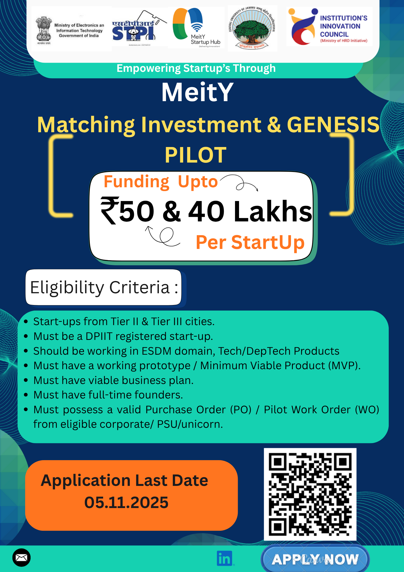 The Genesis Entrepreneur-in-Residence (EiR) Program at CUJ SITE COUNCIL, CENTRAL UNIVERSITY OF JAMMU supported by MeitY Startup Hub, Ministry of Electronics and Information Technology (MeitY), is designed to nurture early-stage tech entrepreneurs with high-impact, scalable solutions. This program offers a structured pathway for aspiring founders to validate, refine, and scale their ideas through a supportive ecosystem that includes financial assistance, expert mentoring, market access, and infrastructure support. With a sharp focus on Tier-II and Tier-III cities, the GENESIS EiR initiative at CUJ SITE COUNCIL, CENTRAL UNIVERSITY OF JAMMU seeks to bridge the gap between innovation and commercialization, especially in underserved regions. By empowering promising entrepreneurs with the right tools and guidance, the program aims to create sustainable innovators and startups that drive digitization, inclusivity, and economic growth in emerging innovation hubs.